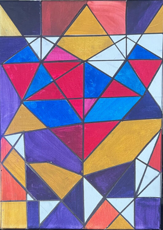 タイトルから、未完成の状態を表した作品なのか、それともこの作品自体が未完成であるということなのかな...などと考えていました。幾何学模様のステンドグラスのような美しさも感じますが見てみると図形は左右対称に近くても色はそうでなかったりして、完全に整えられたものとはまた違った魅力を放っているように感じました。