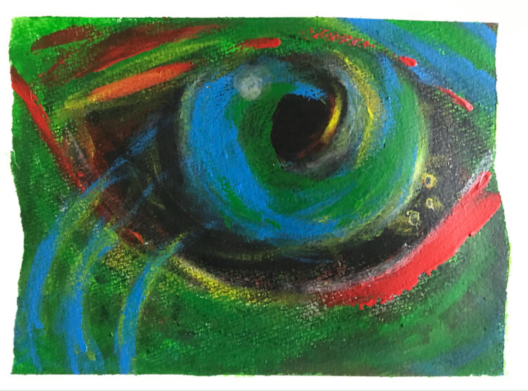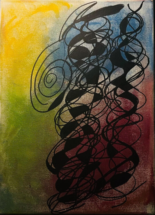 区切られた領域の中で交わることのない色合いの存在感があるように思いました。これらの色は即興的に塗りこまれたのか、それともあらかじめ設計されているのでしょうか。色は一呼吸で塗っていくのでしょうか。制作風景が気になっていました。中心にはハートが浮き出ているようにも見えて、色や形が画面から飛び出してこようとする力を感じました。