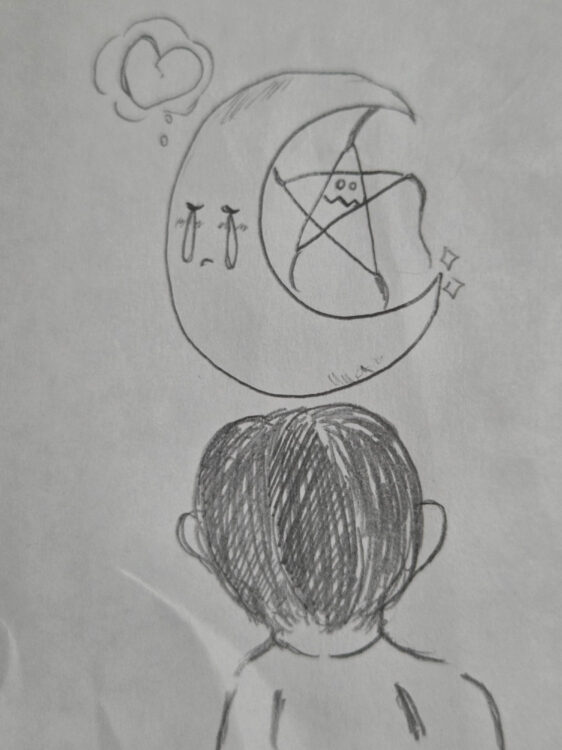 三日月はきらきらしていて大きいけれど、ハートにはすこし罅があり、表情も暗い感じ。星は笑っているようでもあるし、真顔みたいにも見えた。それを見上げているうしろ姿の人は、どんなところに立っているのかなぁと思った。表情は見えないけれど、どんな顔をしているんだろう。夜だけど、寒くないのだろうか。