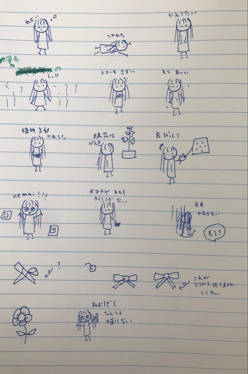 瞬間の感覚や気持ちを切り抜いたような絵が並んでいて、日記みたいにあなたの過ごした時間を保存するものでもあるのかなと思いました。線が多いわけではないのに、言葉と表情や様子で、悲しさや驚きやさまざまな感覚が伝わってくるようで不思議です。私は日々いろいろなことを感じながらも忘れてしまっている気がするので、こんなふうに書いてあるのはすてきだなぁと思いました。