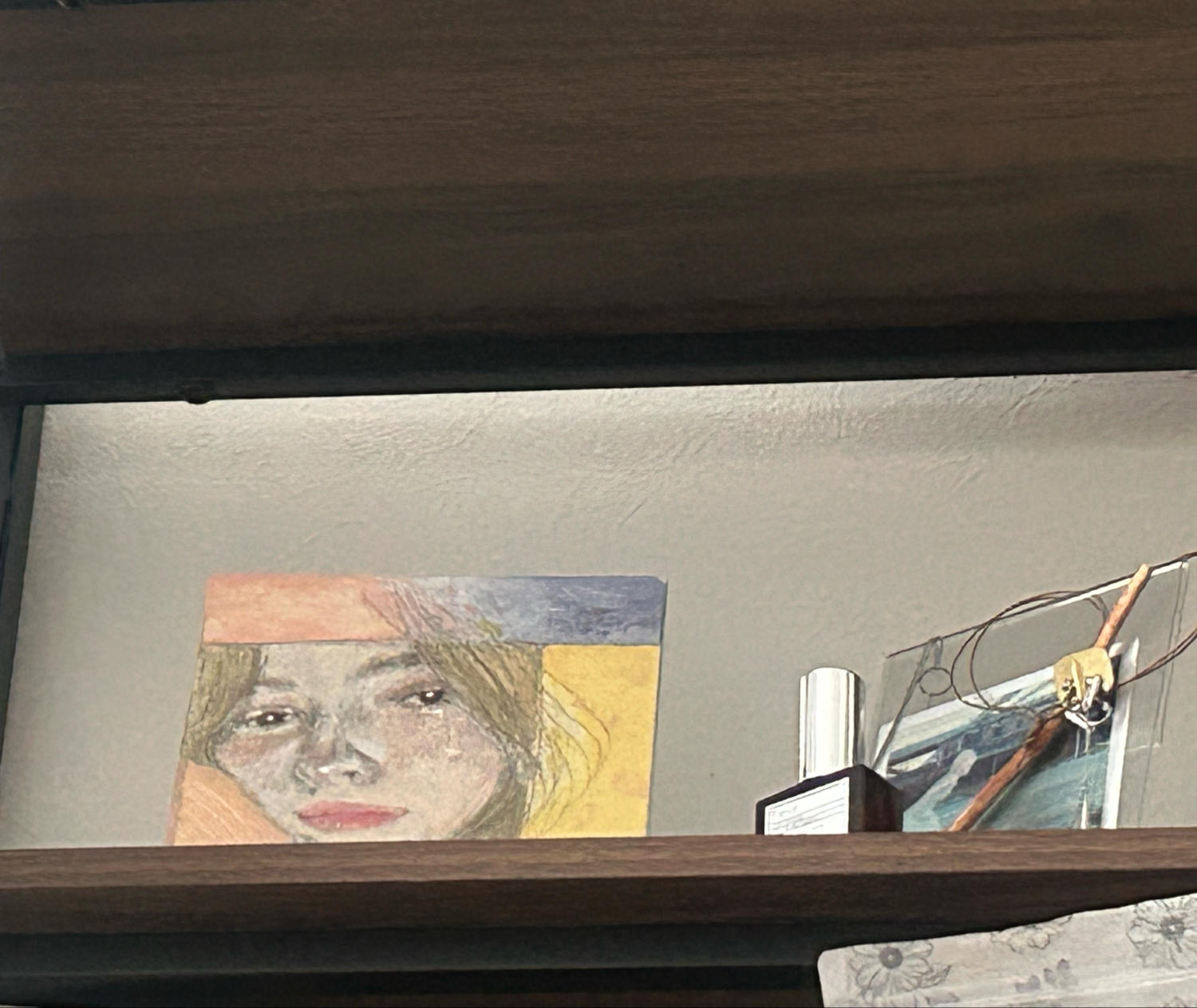 疲労、眠気、寂しさ…ほかにも様々なことを感じながら描いた作品だったのかなと思いましたし、そんな瞬間を自分自身で整理するためにも描いたのだろうか(無意識的に?)…とも想像しました。個人的に、左下の一輪のお花が何だかいいなぁと思いつつ、植物が枯れてしまった悲しい表情と、少し小さく見える身体が印象的でした。