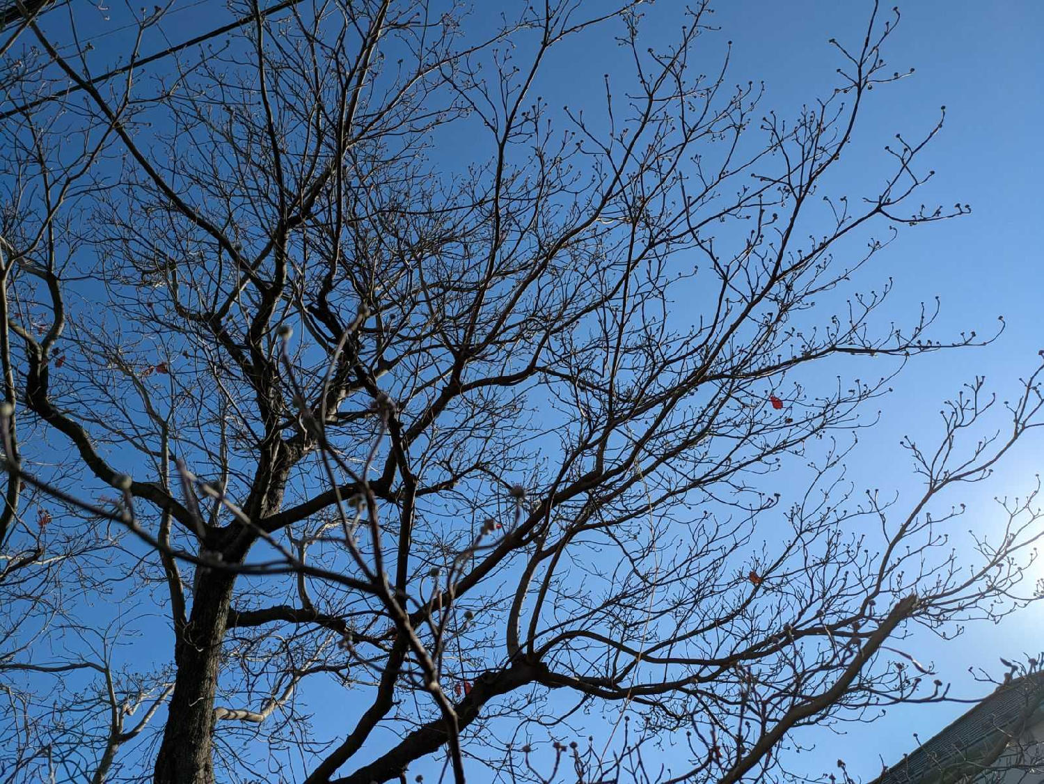 空の青い台紙に黒で枝を伸ばして描いたような、見事な枝ぶりの写真だと感じました。雲のないすっきりとした蒼穹の下に葉も落ちた木は静かにあって、枝は空を向いていて、ひるがえって、なんだか自分をせわしい生き物のようにも感じてしまいます。こうやって見上げて写真をとった時、投稿者さんはどんな心地だったのだろうかと思いました。