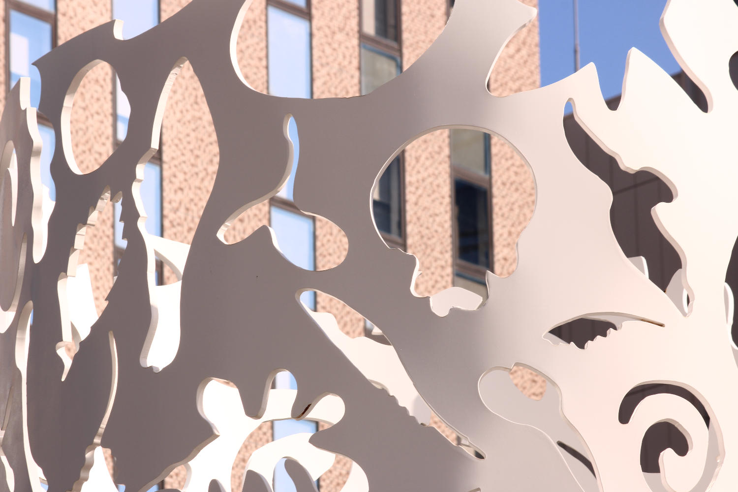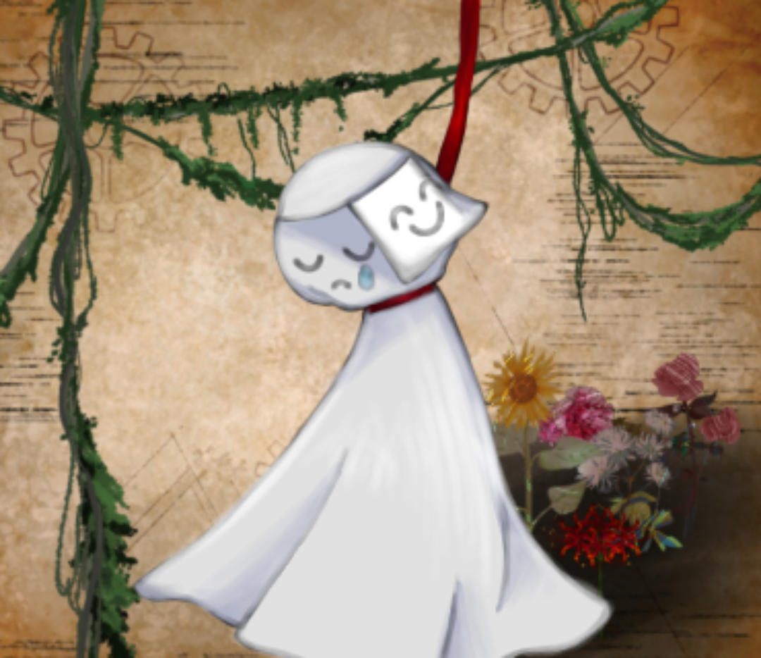 てるてる坊主の後ろで、さまざまな色の花が暗がりの中に満開に咲いているのが最初に目に飛び込んできました。背景になっている歯車は平面的で、立体的な手前側の世界とは蔦に隔てられているようにも見えました。その中で笑みの面をつけたてるてる坊主は花からも距離があってすこし寂しくも感じています。