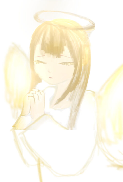 「みんな」を想いながら懇願してる表情に見えたし、握ったその手にはぎゅっと力が込められているんじゃないかなと思った。淡く柔らかい色使いがこの天使の儚さを表しているみたいに私は感じたのと、でも翼には沢山のエネルギーがあるようにも見えて、儚さだけでなく強さも感じた気がしているよ。