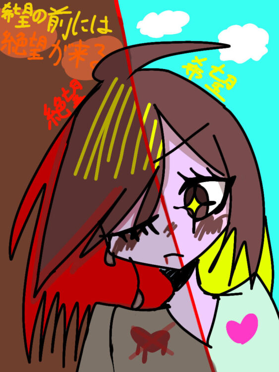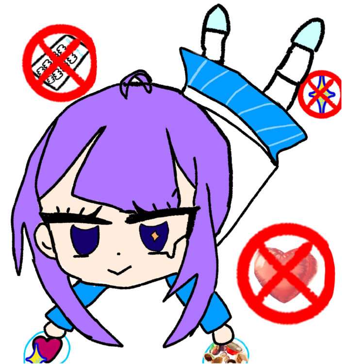 女の子の絶妙な表情も相まって、一見した時点ではちょっとミステリアスな絵だなあという印象を受けました。けれど、モチーフを細かく見ていくことで絵の意味が分かるような仕組みになっているのかな?と思いました。禁止されているのはカミソリ=自傷のシンボル?、女の子がつかみ取っているのは輝いているハートと食べ物……私なりに勝手に解釈してみると、自分を傷つけずに気分が和らぐ方法を見つけたのかな?と思いました。けれどただのハートとキラキラにも禁止マークがついているのが気になります……とっても考察しがいのあるイラストだと思いました。