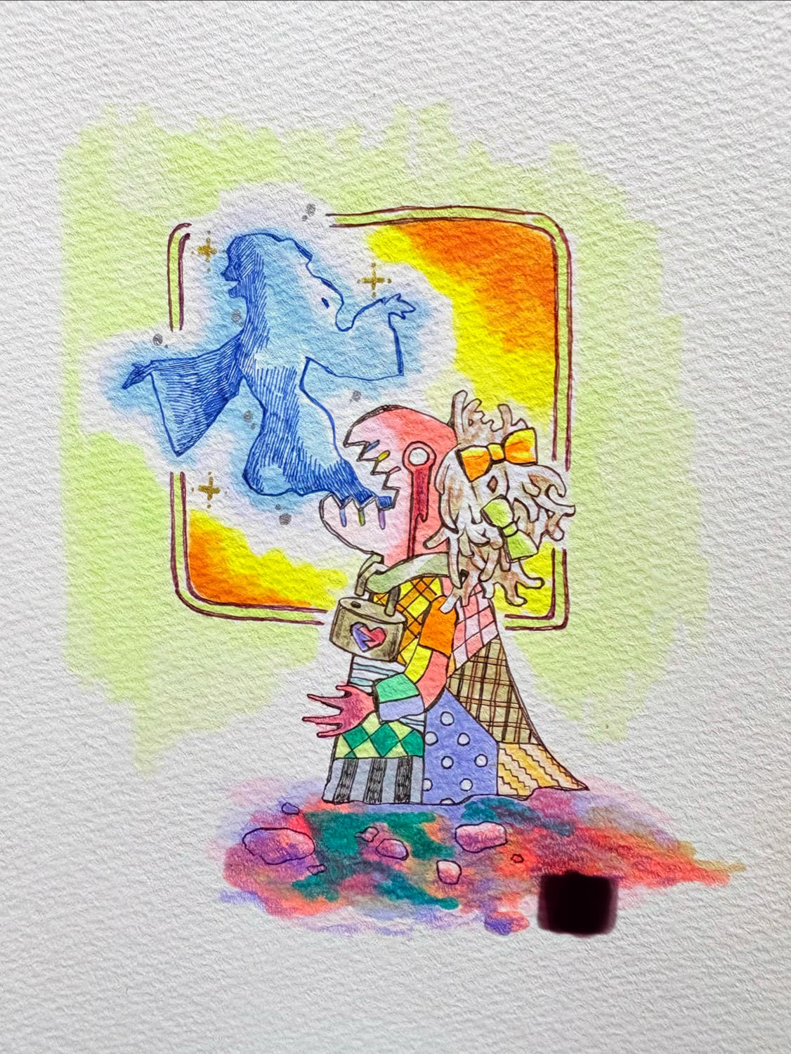 柔らかくも鮮やかな色合いが、目に飛び込んできました。一つ一つのパーツや描写には、いろいろな意味が込められているように感じました。「うたう」ことは、感情を表現する一つの手段だと考えるならば、何かを伝えようと、あるいは表現しようとしている姿のようにも見えました。