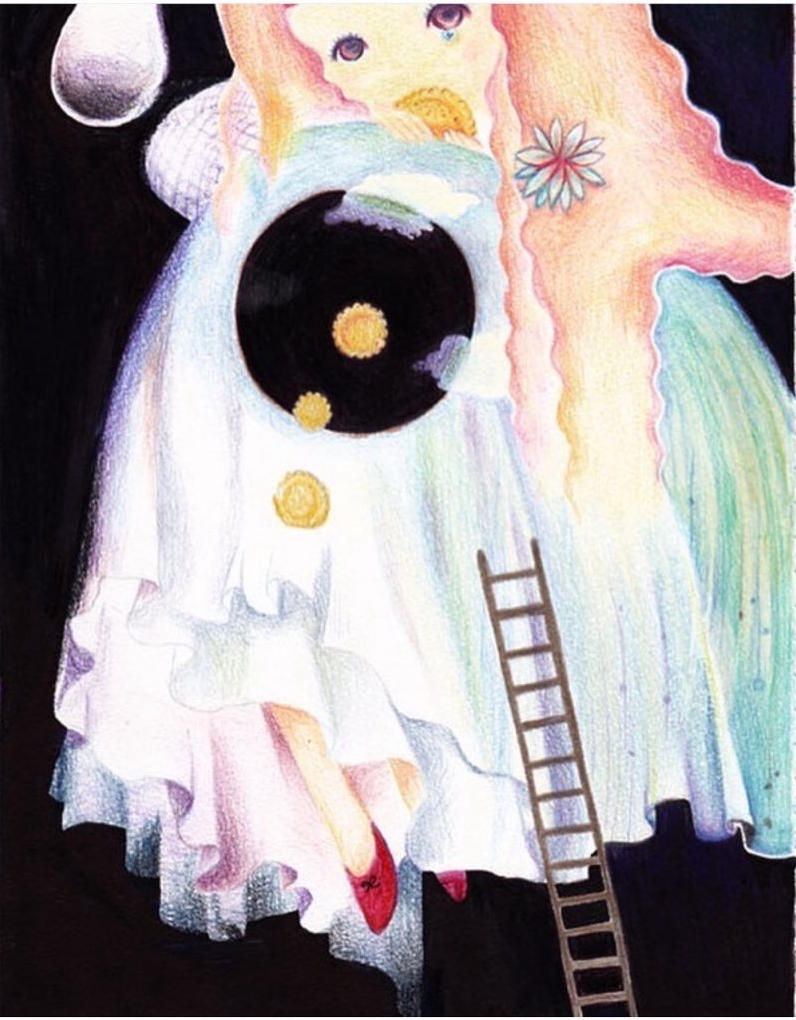 暗く静かな場所から、息を潜めて何かを伺っているような表情に見えました。揺れている瞳は、涙を溜めているようにも感じました。喉元のハートにバツ印が被せられているのは、心の声を失ってしまった象徴のようなマークなのでしょうか。いろいろと想像しながら眺めていました。