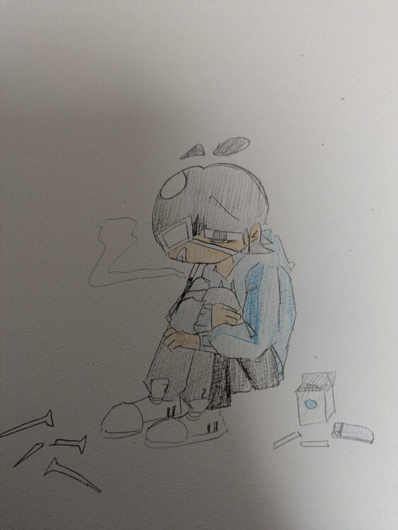 周りにはタバコやトゲのようなものがあり、心の辛さを表しています。感想1