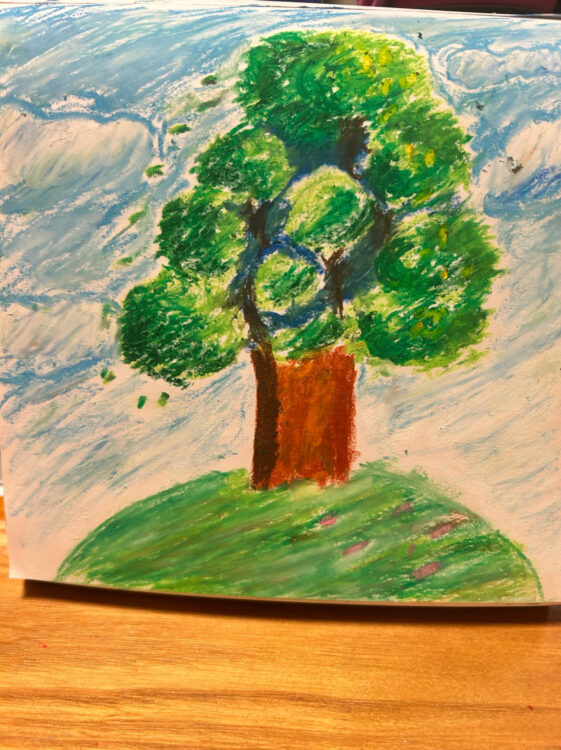 一本の木のあるちいさな丘、だれかこの場所を知っているのでしょうか。秘密の場所でしょうか。天気もよさそうで、ピクニックをしたいような、ただひっそり昼寝をしたいような。だけど、風は少し強いのかもしれませんね。葉っぱがむこうへ舞っていって、どこかから物語をつれてくるような気がしました。