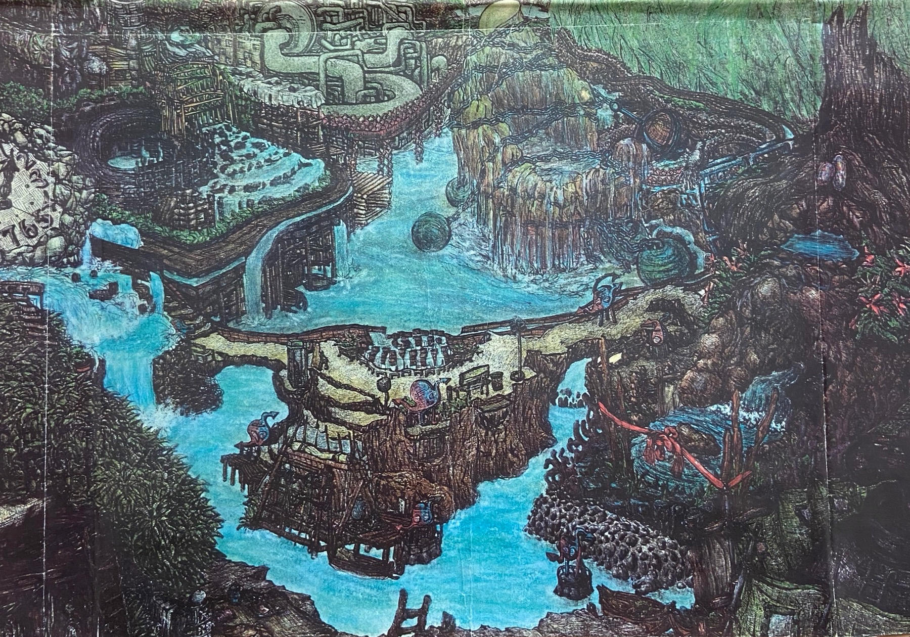 ファンタジーの最初にある世界地図や、たくさんの労働者が汗を流しながら働く高山の遠景の写真を思い出しました。工業的な仕組みが作り上げられた土地で、自由というには、なんだか不穏な感じがします。時間が支配する空間の中で、矢印のようなものをふたつつけたものは生命なのでしょうか。ここにはたくさんの労働がありそうなのに、ひとかげがないのが気になります。かれらが逃げ出したか、あるいは消滅したあとの世界なのだろうか…と思いを巡らせていました。