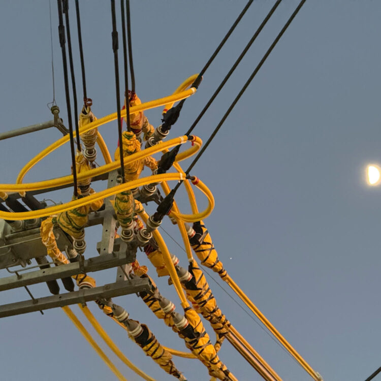 薄暗い空との対比で、鮮やかな人工色の黄色が目に入ってくるなぁと感じました。整然と組まれた配線には、静かな佇まいながらもどこか規律性のようなメッセージを受け取っています。投稿者さんの日常の風景の一つなのだろうかと、想像を巡らせています。