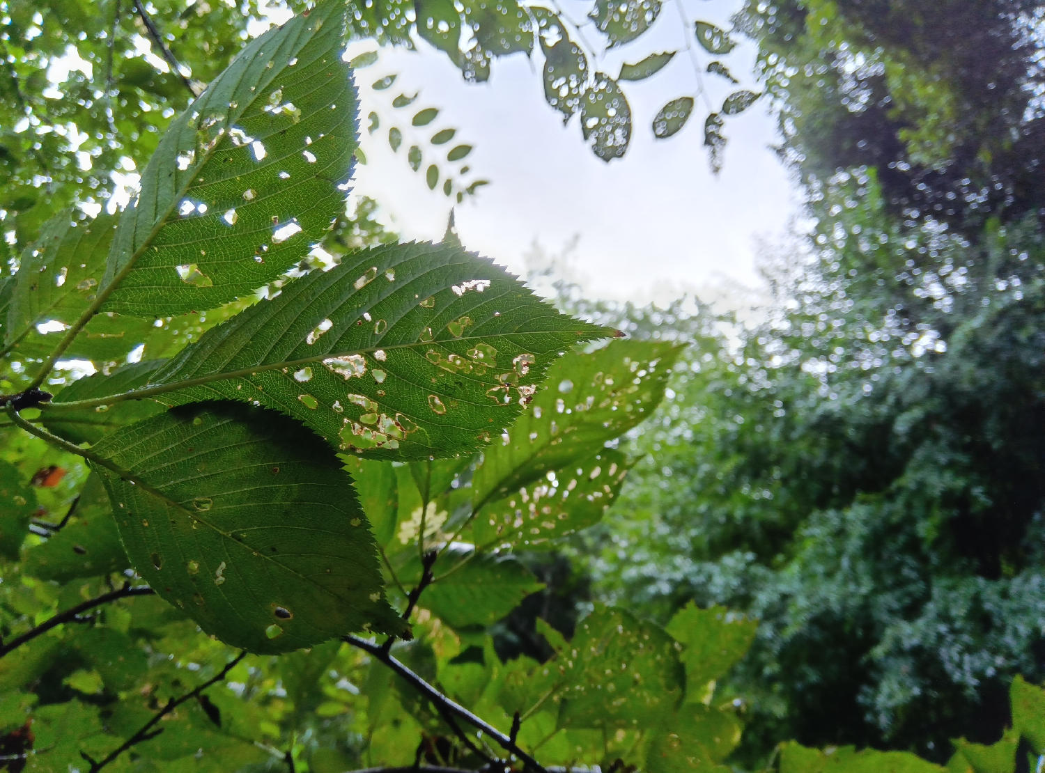 トンネルのように木々があり、その隙間から白い空が見える。人のだれもいない道に静けさを感じました。一人でこの中を歩いていると、すこしだけ、いつもとは違うリズムで過ごすことができるかもしれない。道の向こうには車道があるように見えるので、それはまたこの道とは違うリズムのある場所なのかなとも思いました。