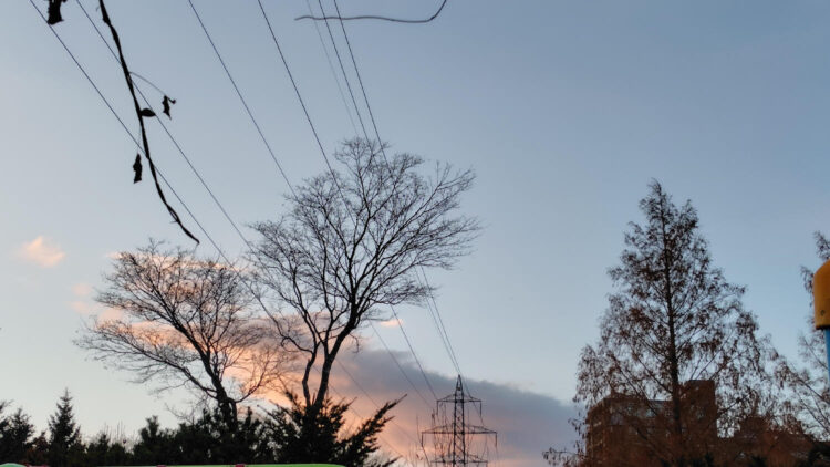 今日という日そのものを「素敵」ということで祝福しているみたいだと思いました。「素敵だった」の中には、投稿者さんの感性から現れた部分と、空や木々や鉄塔や空気、そのほかの目に映る・映らないさまざまなものから受け取った部分とが混ざり合っているのかなと思いました。枝の先のほうまで美しいレースのような木々と、すこし薄暗くなってきた空の向こうの雲が薄桃色に色づいているさまはそのままで完璧だと感じてしまうようなハッとする風景のように感じます。
