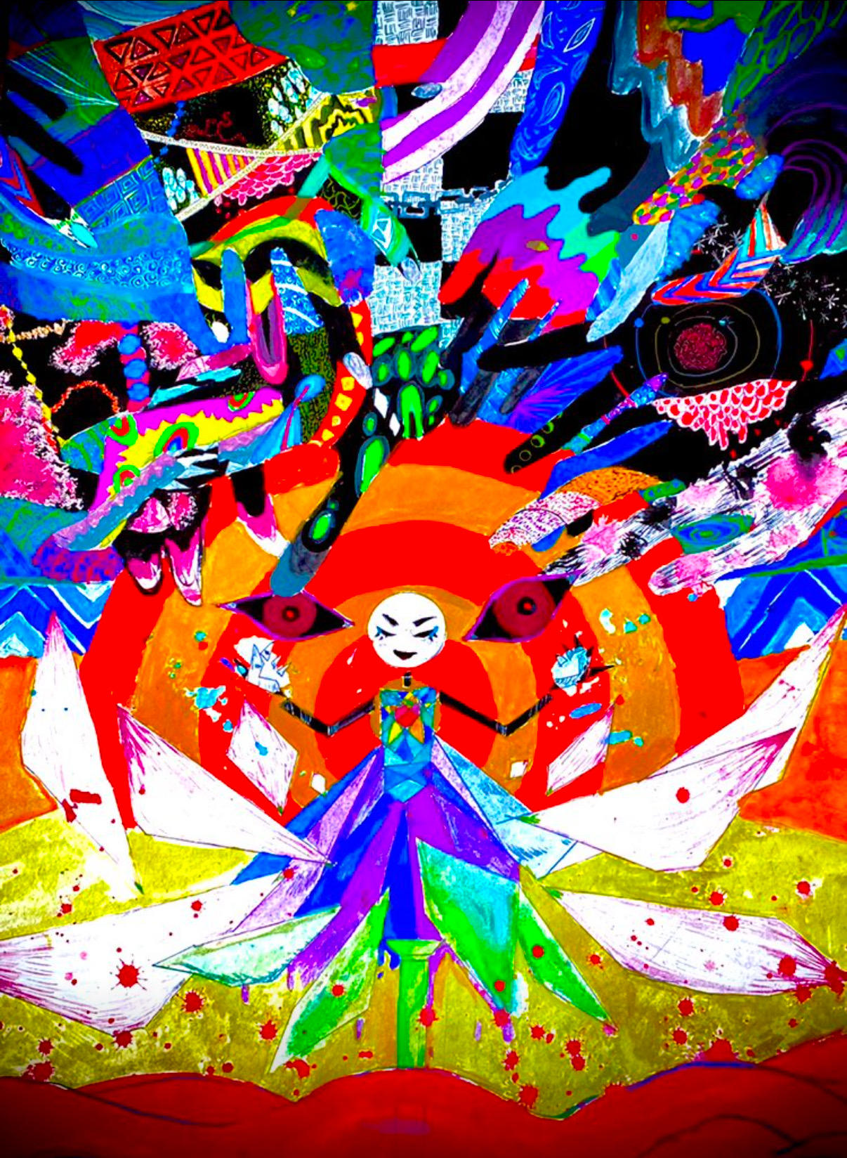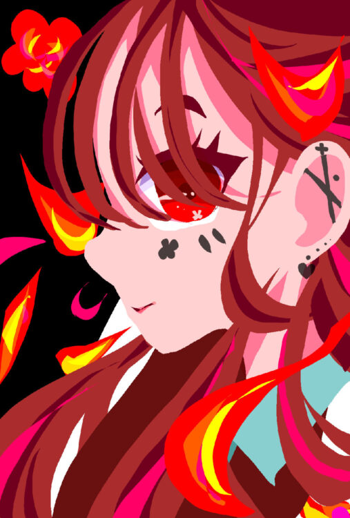 黒と赤のコントラストが綺麗だなと感じつつも、何かを言いたげに、やや怒りも感じる視線でこちらをみつめる子は、「境界線を踏み荒らされた」・もしくは「もう立っていられる場所が”ここ”しか残っていない」そんな気持ちでいるのだろうか…って、立っている場所や中央の黒い穴・様々な色使いから想像しているところです。色使いには、あなたなりのこだわりや、湧き出てくる感覚もあったんじゃないだろうかと、これも私の想像です。