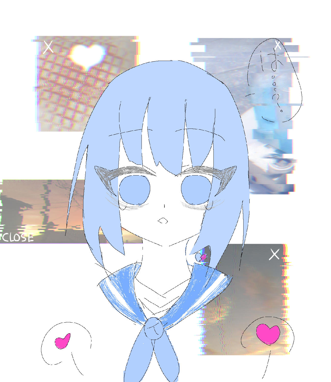 写真とハートの中の暖色が遠く、記憶のウィンドウがノイズの中で呼び覚まされつつ消えるようなシーンだと感じました。停止ボタンを押されたように言葉が出てこない瞬間。細い線とうす水色一色で塗られた瞳と髪の毛が、このひとの存在をなにか希薄にしているような感じがして、なんだかさびしさを感じました。