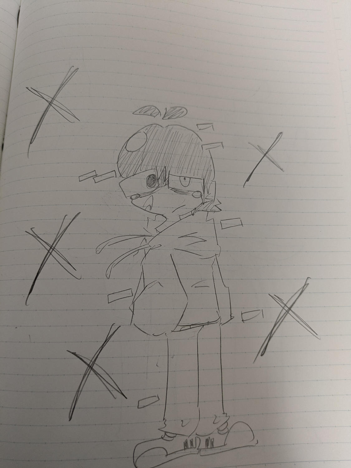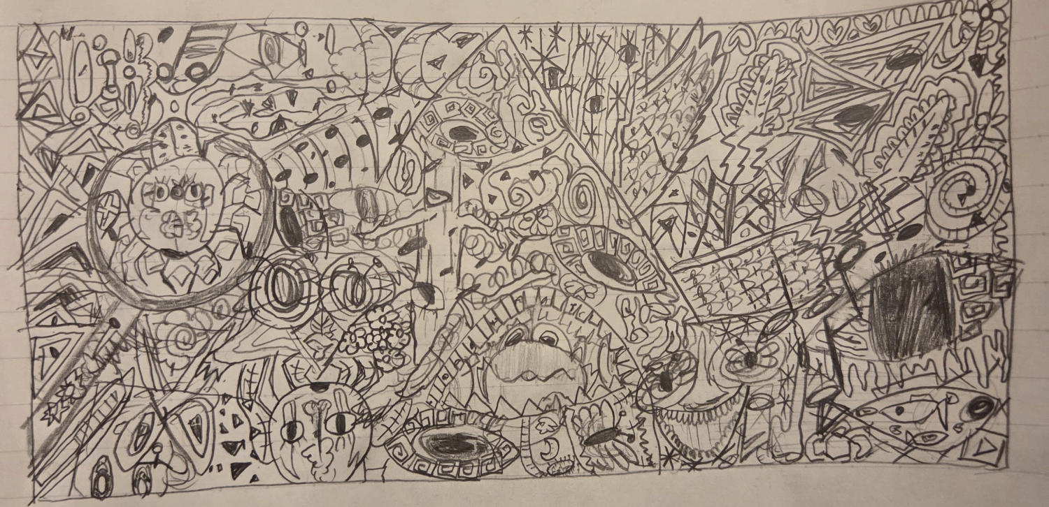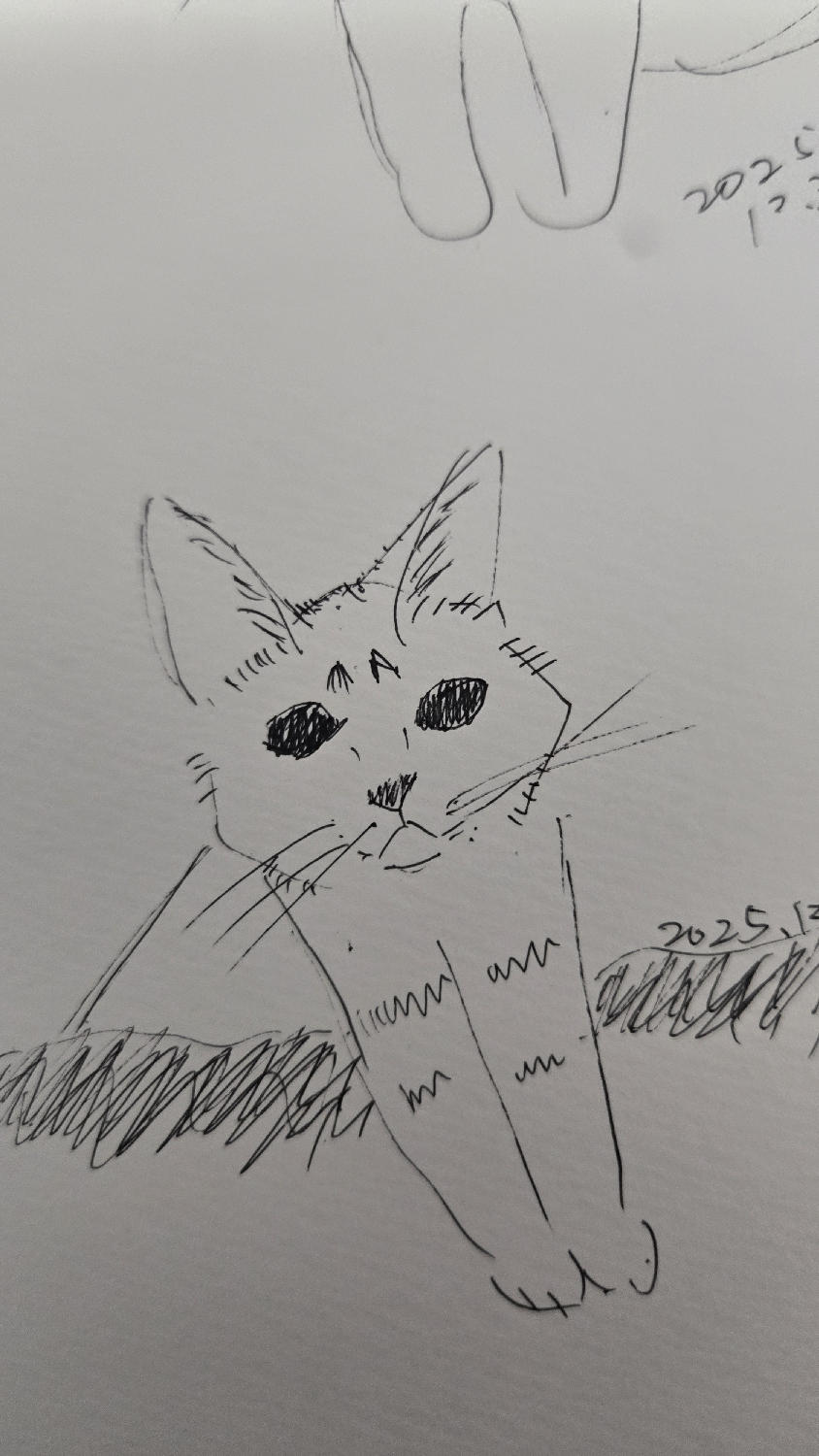 いくつか似た絵を描いたうちの一枚なのかなと、上の方に見える柔らかそうな手(前足?)を見てそう感じた。中央の子は、少し困り顔にも見えたけど、誰かのなにかの気持ちに、そっと静かに寄り添っている表情をしてるようにも私は思えた。ボールペン?で書いたのかなぁ。仮にもしそうだとしたら、ボールペン特有の、サッとしたいい音の書き心地を感じられる作品だなって思った。