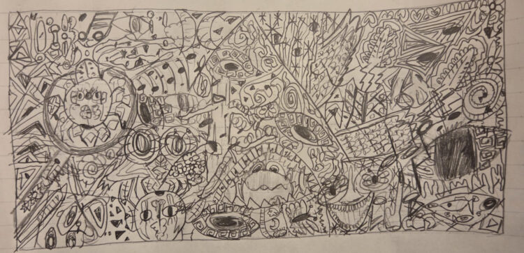 左右の絵での対照的な表情が印象的ですが、タイトルにある音の鎧をまとっているように見える方の絵は上下逆さになっていて、投稿者さんにとって音楽を聴くことは、日常的に感じている、敵のようにさえ感じられるような怖いものから一時的にでも守ってもらえてほっとできる瞬間なのかなと想像しています。