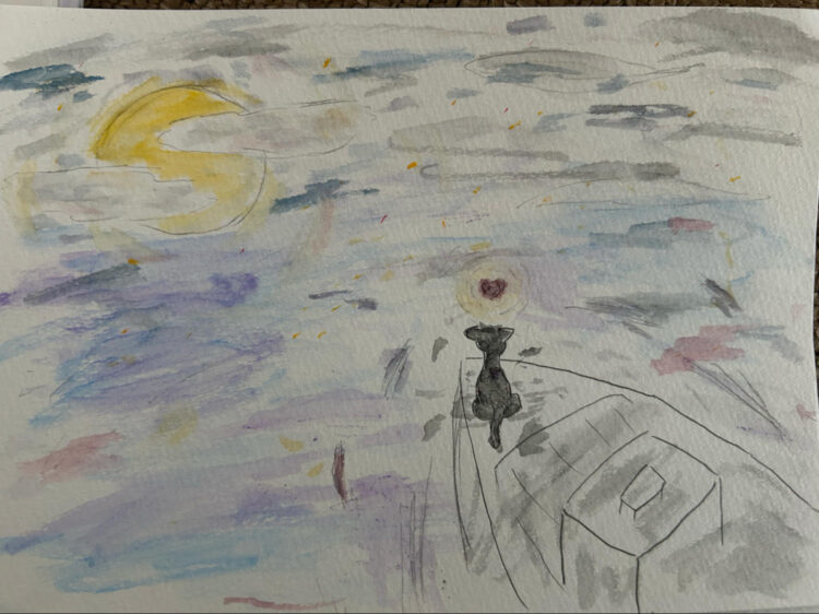 海から、綺麗な光も感じたし、海の近く特有の少し冷たい空気や少し勢いのありそうな波音まで伝わってきたような気がしました。でもどこか寂しい感覚や、心にある(かもしれない)葛藤も、「海」として表現しているイメージも感じました。夜を照らしている月と、手前にくろく写る人の対比を感じながらも、立っている場には光が集まっている気もして、そんな色合いに興味をもちました。