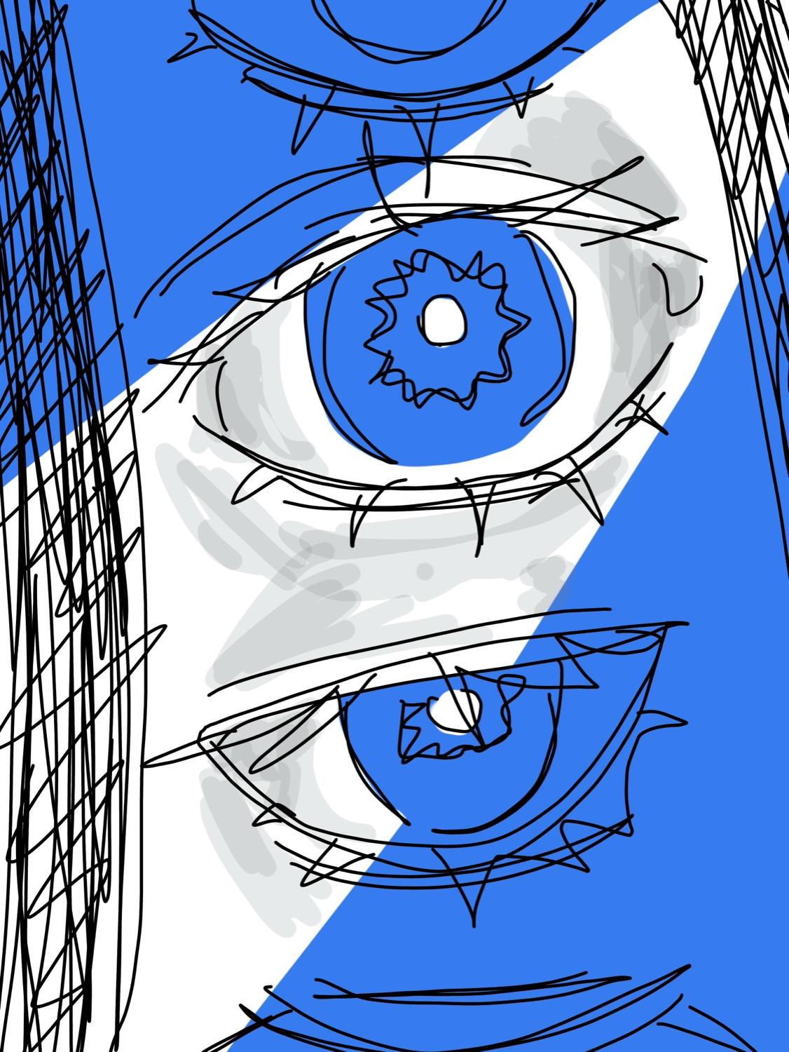 デザインとしてかっこいいという印象でした。青の色がいいし、目の周りの影も淡くてちょうどいい感じでさらっと書いたような印象も刹那的なかっこよさがあるなと思いました。人の目って情報の宝庫で、憎しみも悲しみも喜びも多様な感情を表現できるおもしろい題材だし、自分の何かを表現するには面白いかもと思いました。