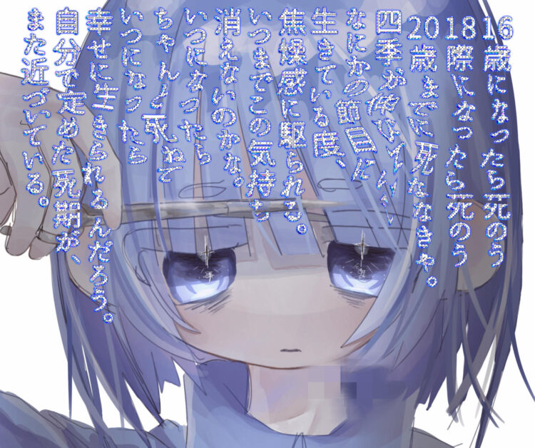 投稿者さんのこれまでの生きてきた道のりのことを知っているわけではないし、完全に感覚が同じではないかもしれませんが、文章を読んでいてあぁ分かるなぁ...生きることだけでなく自ら死ぬことも易くないよな...と共感を覚えました。季節の移ろいや誕生日がきて年を重ねること、そんな一つひとつにもまだ生きて(しまって)いるという風に感じられて自らそちらに向かわなくてはならない気分になる時のことを思い出しました。描かれた子はどんな気持ちで前髪を切ろうとしているのだろう...と気になりながら揺らめく文字を読んでいます。