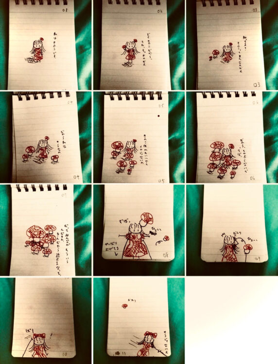みんなに言われるからきんなんだって、でも、きのこはかわいいからいいんだって。6枚目あたりではきのこの防御壁をつくっているみたいで、私はその感じも好きだなと思いました。でも最後にはきのこじゃない自分になって画面のそとに消えてゆく子の、背中を追いかけたいような気持ちになりました。きのこみたいな、赤い水玉模様はかわいくて、そのワンピースをまとってどこに向かってゆくのだろう。