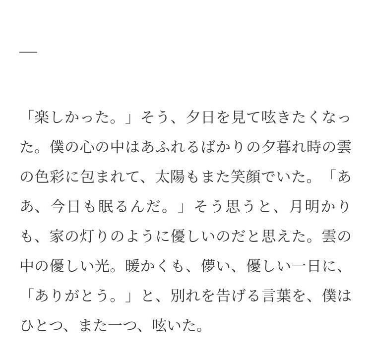 果てしなく広い空間に、身体ごと放り出されて漂っているような感覚を抱きました。「ただの僕」は、「今ここ」の僕でもあるのだろうかと考えました。一つ一つの文章にはどこか清々しさもあって、読んでいてリラックスしている自分がいました。