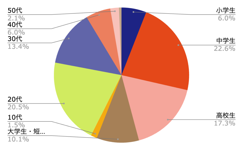 年代は中学生が最も多く22.6%を占めました。次いで、20代、高校生の順に多くなっていました。